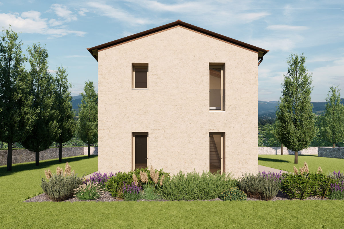 Questa casa monofamigliare si sviluppa su due piani, con una superficie totale di 137mq calpestabili. Caratterizzata da un tetto parallelo al lato lungo e dispone di un ampio porticato di 40mq sviluppato su due piani.