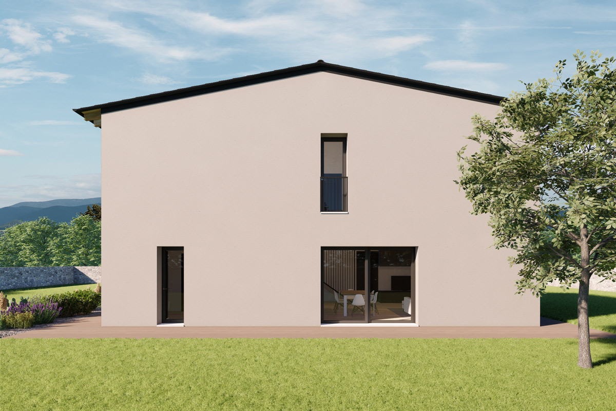 Questa abitazione unifamiliare di design classico si sviluppa su due livelli ed è caratterizzata da un tetto a falda unico, conferendo eleganza e funzionalità. È la scelta ideale per coloro che cercano una casa spaziosa, raffinata e funzionale.