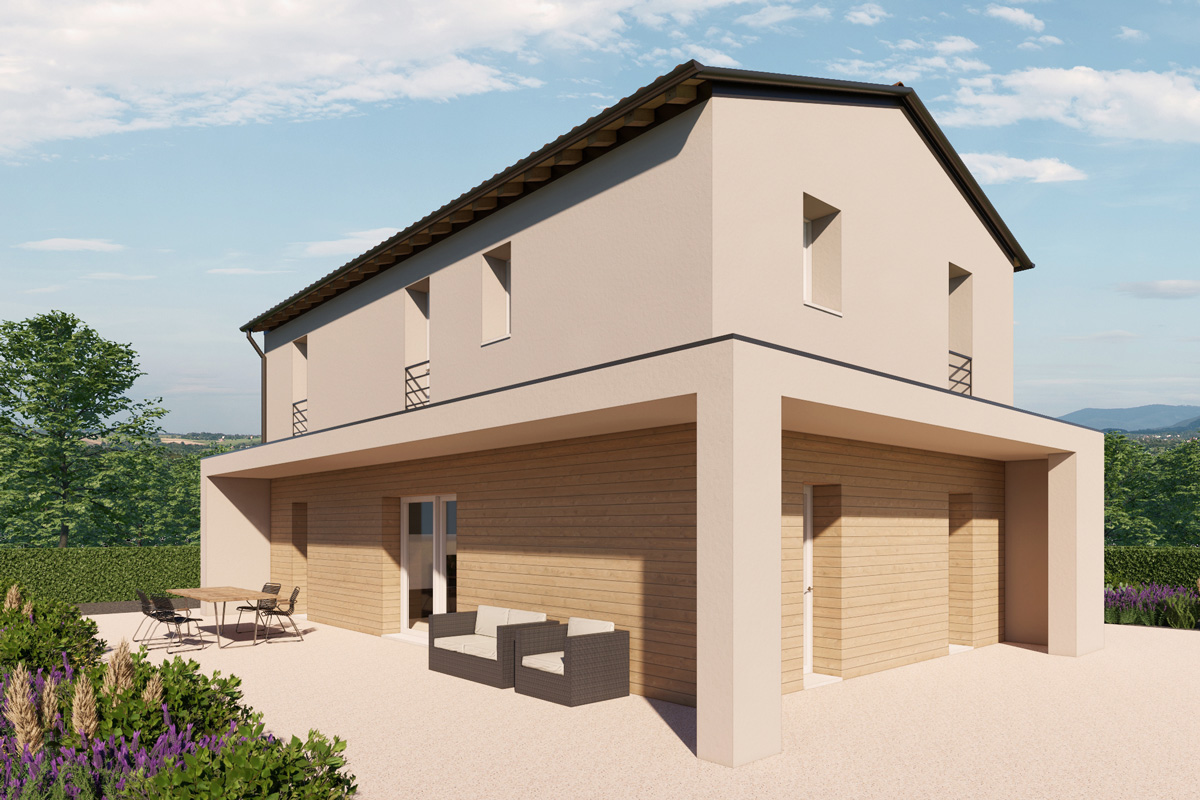 Questo modello di casa incarna uno stile contemporaneo e minimalista, con un design distintivo caratterizzato da due volumi accostati che si sviluppano su due livelli. Questa disposizione architettonica dona alla casa un tocco di originalità.