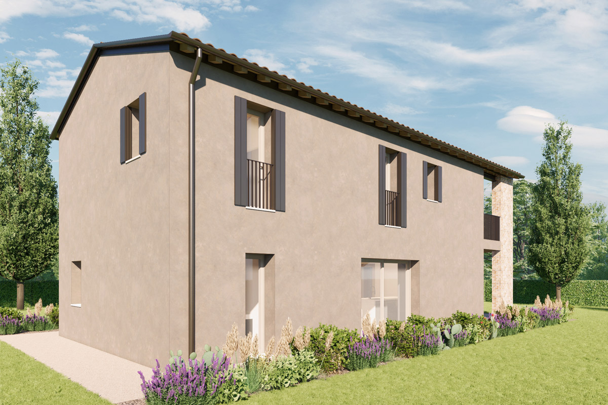 Questa casa monofamigliare si sviluppa su due piani, con una superficie totale di 137mq calpestabili. Caratterizzata da un tetto parallelo al lato lungo e dispone di un ampio porticato di 40mq sviluppato su due piani.