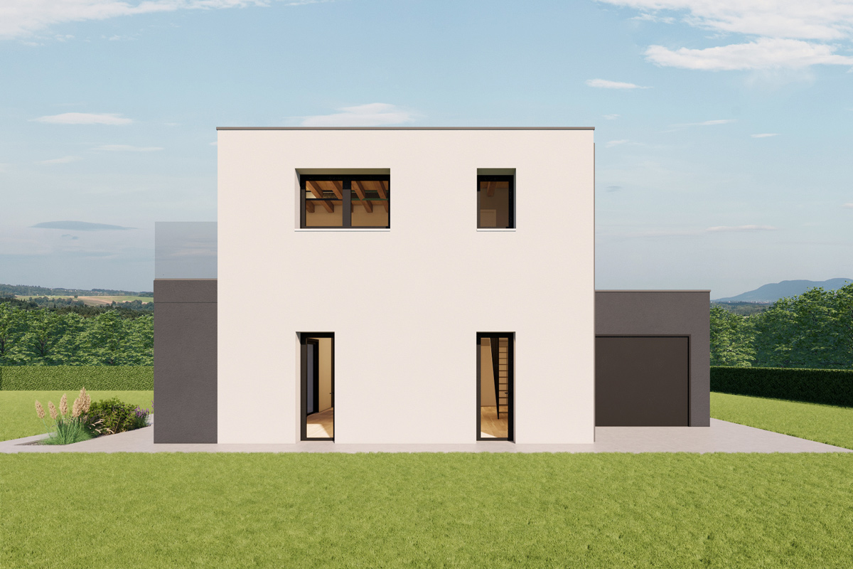 Questa moderna casa a tetto piano e tettoia di 23mq offre uno stile contemporaneo e minimalista. Con una metratura interna di 156mq, la casa si sviluppa su due piani. Accanto alla casa, è presente un garage per l'auto.