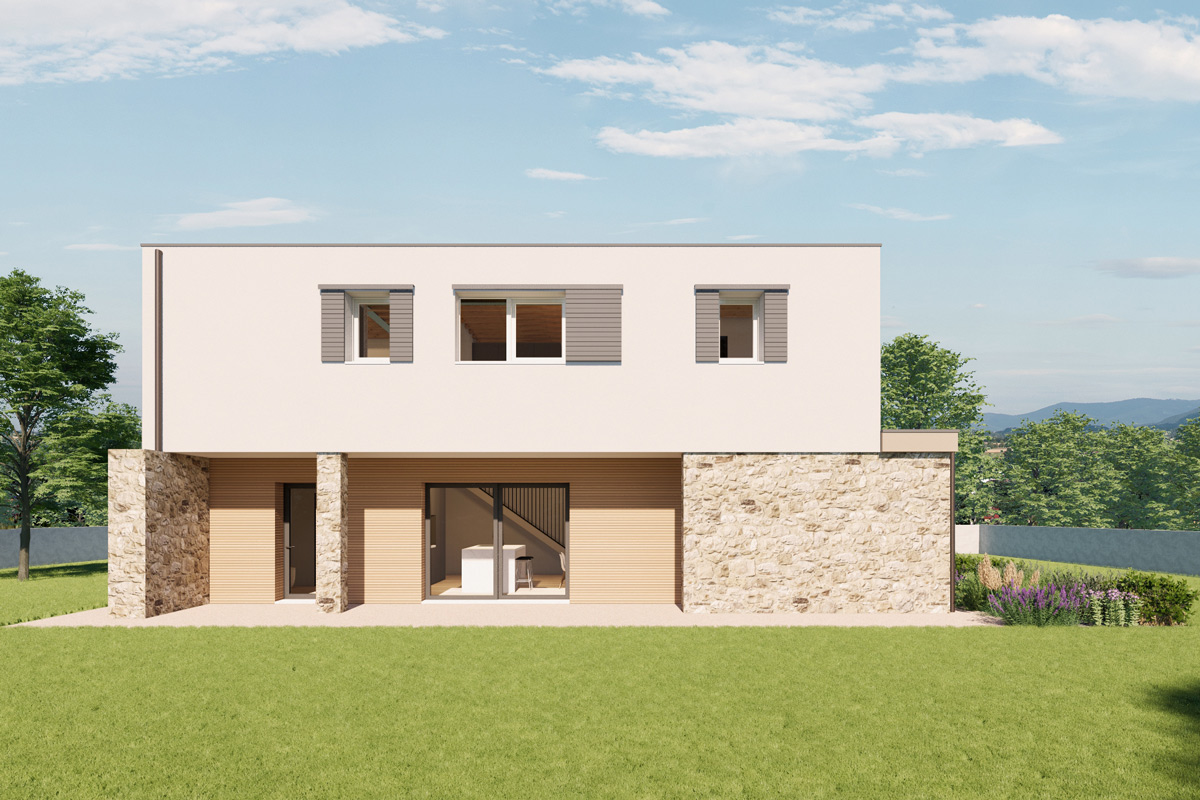 Questo modello di casa incarna uno stile contemporaneo e minimalista, con un design distintivo caratterizzato da due volumi accostati che si sviluppano su due livelli. Questa disposizione architettonica dona alla casa un tocco di originalità.