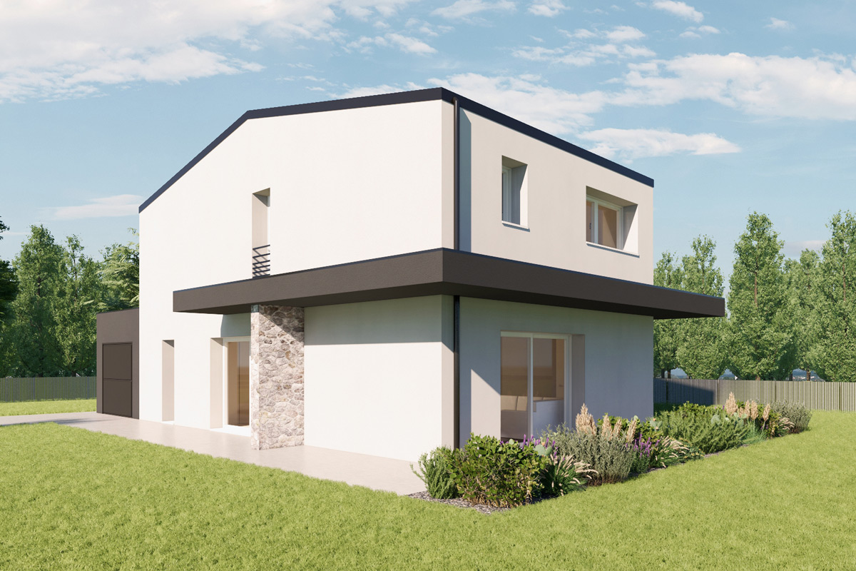 All'interno, la metratura su due piani è ottimizzata per offrire ampi e confortevoli spazi. Questa soluzione abitativa rappresenta un'opzione esteticamente distintiva e funzionale per la vostra famiglia, unendo design moderno e praticità in un'unica soluzione.