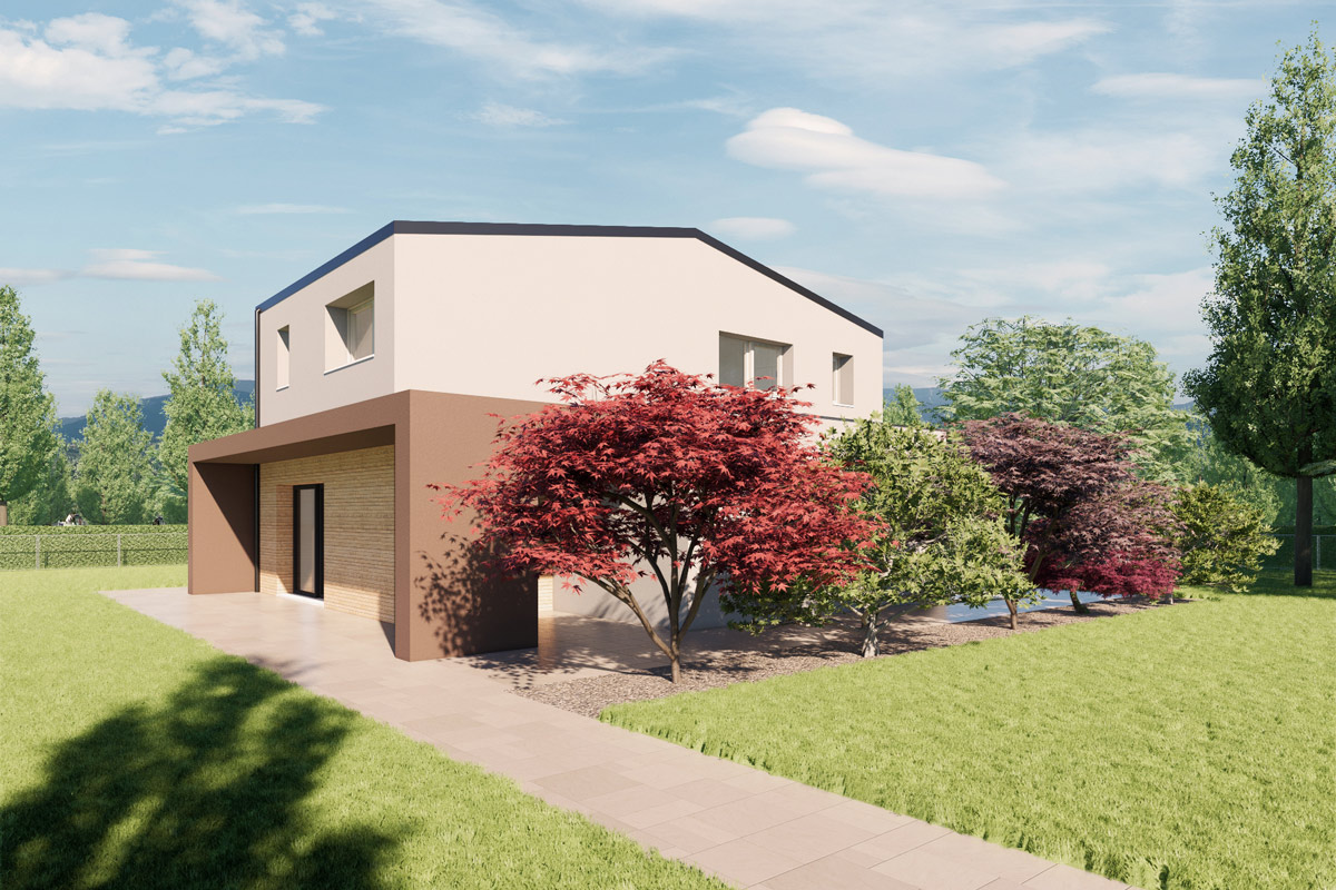 Questa casa monofamigliare si sviluppa su due piani, con una superficie totale di 137mq calpestabili. Caratterizzata da un tetto parallelo al lato lungo e dispone di un ampio porticato di 40mq sviluppato su due piani.